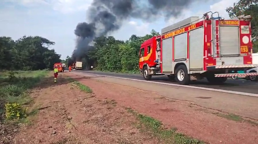 Um acidente que envolveu três caminhões causou a morte do motorista de um dos veículos na BR-153, nesta quarta-feira (13). A batida foi por volta das 15h40 e um dos caminhões pegou fogo. A vítima ainda não foi identificada.