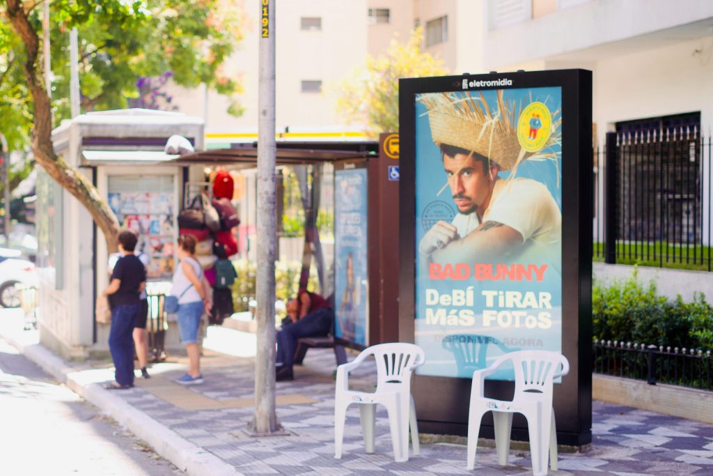Publicidade do álbum ‘Debí Tirar Más Fotos’, de Bad Bunny, em ponto de ônibus de São Paulo