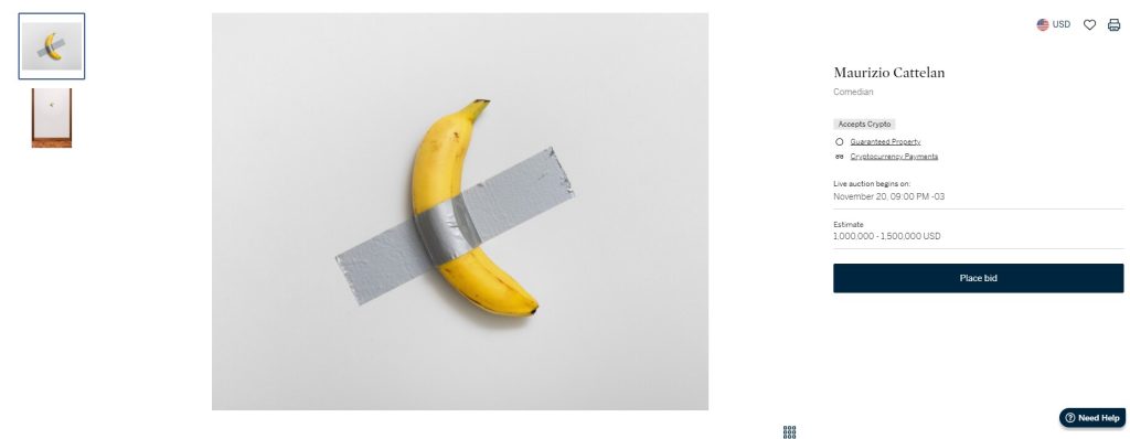 “Comedian”, cuja primeira versão foi feita com uma banana que custava 25 centavos, passou de um preço inicial de 800 mil dólares na quarta-feira para 5,2 milhões dólares, mais a taxa do comprador.