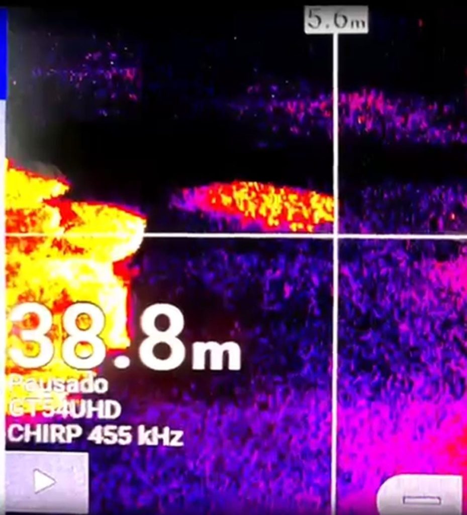 A Marinha informou que está utilizando um equipamento chamado SideScan Sonar, que identificou a possível localização de um dos caminhões, a aproximadamente 40 metros de profundidade. Veja na imagem abaixo.