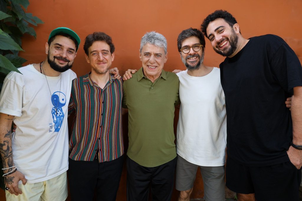 Pedro Altério (à esquerda), Vinicius Calderoni (de camisa listrada), Tó Brandileone (de óculos) e Pedro Viáfora (à direita) posam com Chico Buarque (ao centro) no estúdio