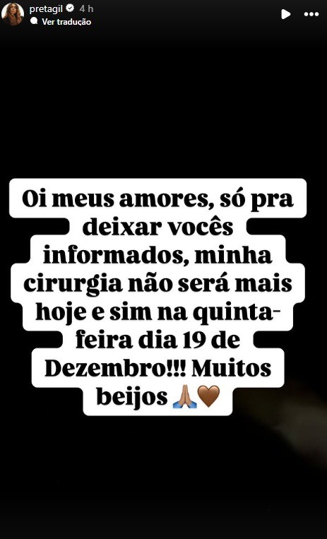 A cirurgia que Preta Gil faria neste domingo (15) para a retirada de tumores foi adiada para quinta-feira (19). A própria cantora avisou a mudança em sua conta no Instagram. Ela não informou o motivo.