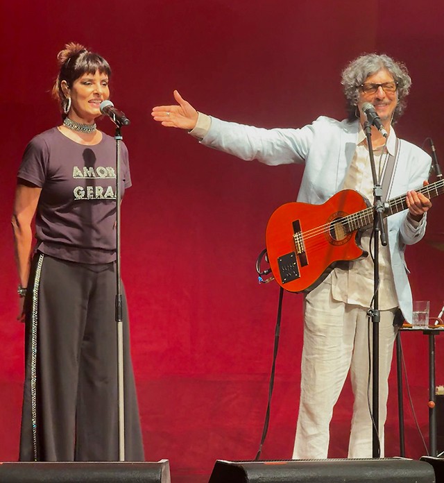 ♩ “Vim a caráter”, gracejou Fernanda Abreu, diante de Pedro Luís, apontando para a camisa que vestia com a estampa “amor geral”, título do álbum lançado pela artista em 2016.