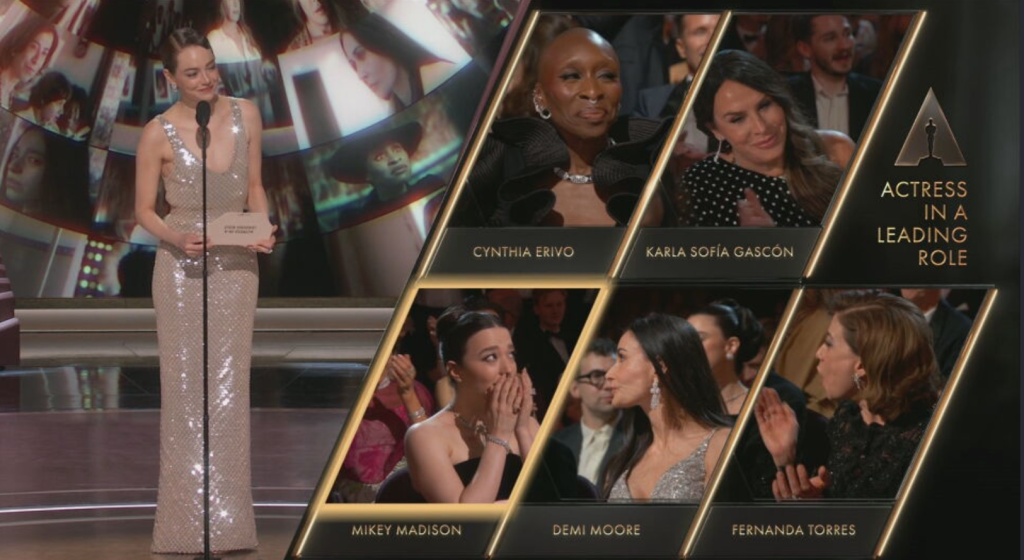 Emma Stone anuncia prêmio de melhor atriz no Oscar 2025; Fernanda Torres, Mikey Madison, Demi Moore, Karla Sofia Gascón e Cynthia Erivo