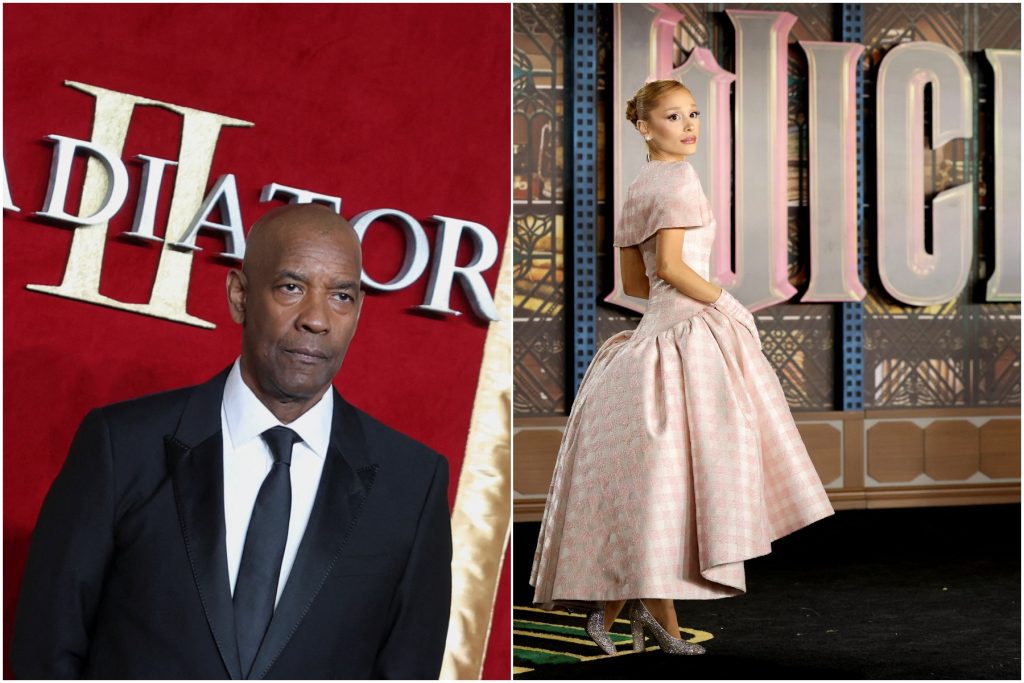 À esquerda, Denzel Washington participa da estreia global de ‘Gladiador II’ em Londres, Grã-Bretanha. À direita, Ariana Grande participa da estreia do filme “Wicked” no Dorothy Chandler Pavilion em Los Angeles, Califórnia.