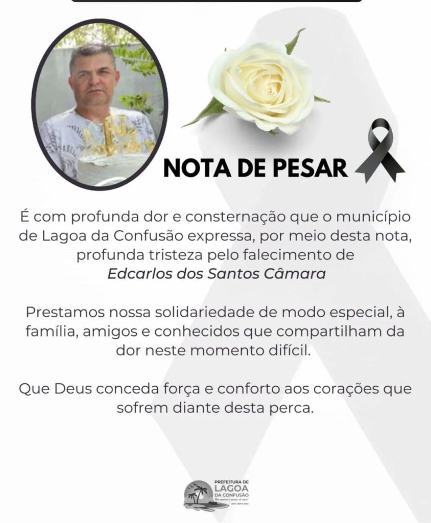 A Prefeitura de Lagoa da Confusão divulgou uma nota de pesar lamentando a morte de Edcarlos. “Prestamos nossa solidariedade de modo especial, à família, amigos e conhecidos que compartilham da dor neste momento difícil”, diz nota divulgada nas redes sociais.