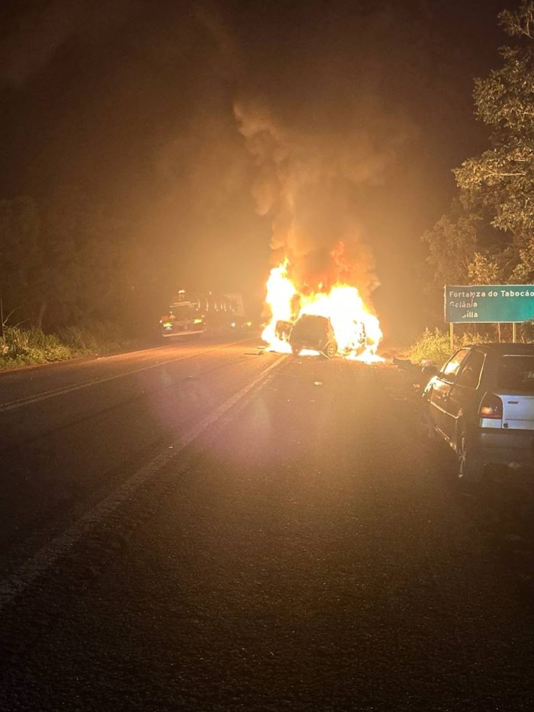 Na rodovia BR-153, próximo de Tabocão, região central do Tocantins, uma batida envolvendo quatro carros deixou três pessoas feridas na madrugada de domingo (19). Dois veículos pegaram fogo após a colisão. Segundo a Polícia Rodoviária Federal, a suspeita é que o acidente tenha sido provocado após um dos veículos invadir a pista contrária.