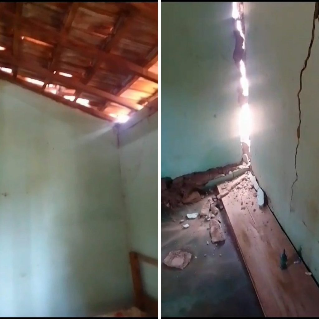 Vídeo gravado por idosa mostra telhas quebradas e rachaduras em paredes