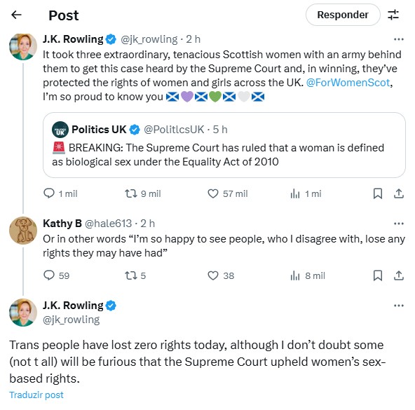 “Pessoas trans não perderam nenhum direito hoje, embora eu não duvide que algumas (não todas) ficarão furiosas porque a Suprema Corte manteve os direitos das mulheres baseados no sexo”, respondeu. Nos último anos, JK Rowling assumiu uma postura aberta contra mulheres trans, alegando que elas “não eram mulheres”.