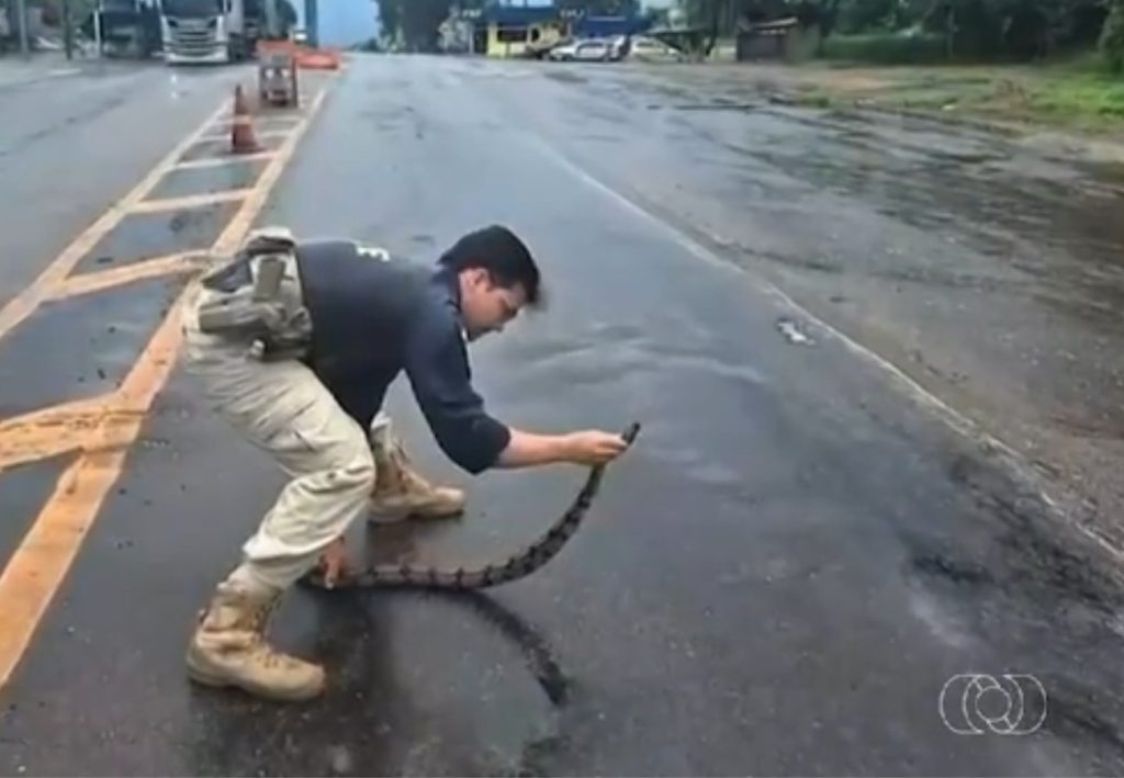 Policial rodoviário federal retira jiboia do meio de rodovia no Tocantins