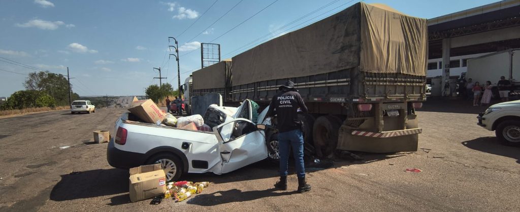 Clique aqui para seguir o canal do g1 TO no WhatsAppCom o impacto da batida, a picape, que estava carregada de produtos alimentícios, acabou batendo em um caminhão que estava parado na frente do posto de combustível.