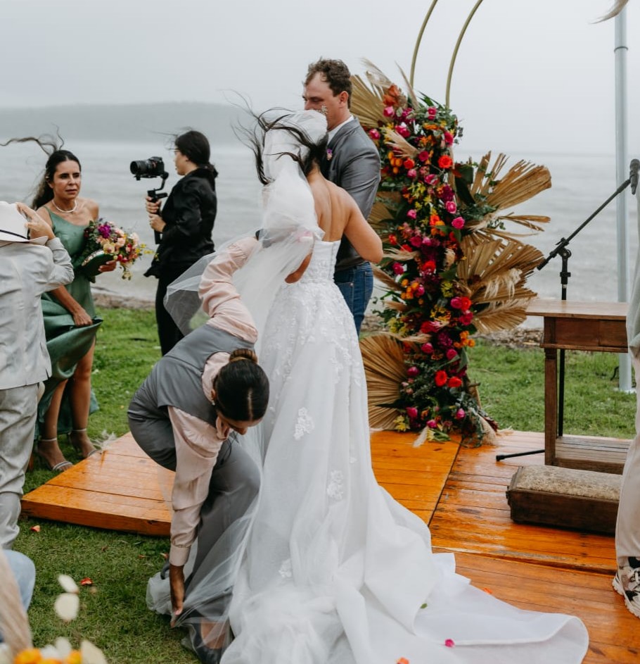 “É o dia mais importante da noiva, então, por mais que teve os imprevistos, não podemos deixar de registrar. Realmente estava chovendo muito e molhando nossos equipamentos, demos o nosso jeito porque o importante era registrar tudo para os noivos. Além de ter sido um momento muito divertido para todos, em que os convidados estavam brindando, comemorando e sorrindo da situação, era indispensável não captar”, contou Bárbara sobre a experiência de cobrir a cerimônia.