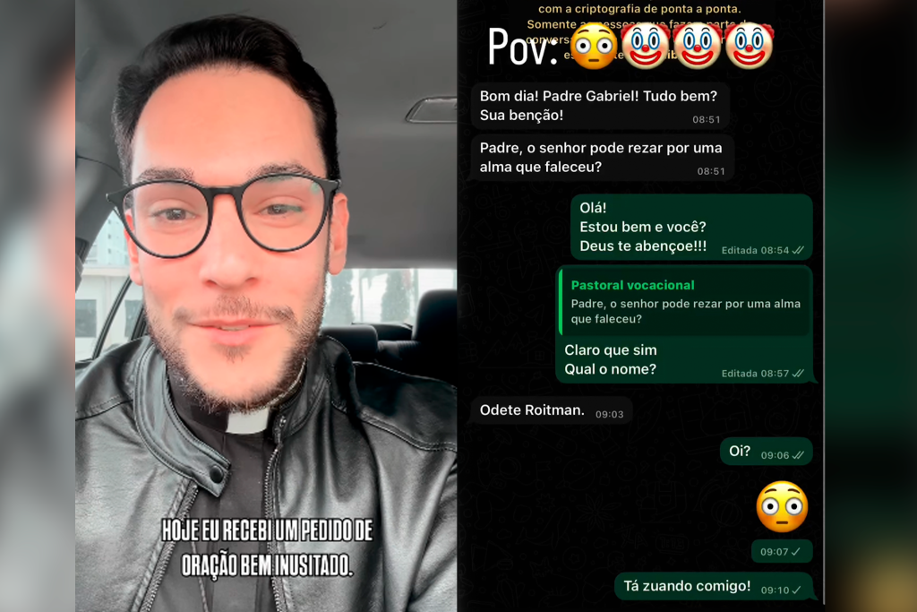 O padre Gabriel Natan, vigário da Paróquia São Francisco de Assis, em Blumenau (SC), compartilhou com seus seguidores um pedido de oração que recebeu nesta semana. Um membro da igreja pediu que ele rezasse pela personagem Odete Roitman (Débora Bloch), que havia acabado de morrer em “Vale Tudo”.
