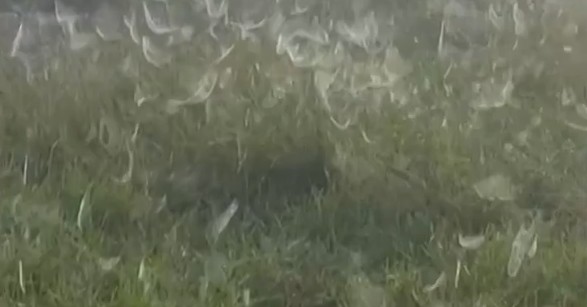 As responsáveis por essa paisagem são aranhas imaturas que nascem em grande número e ficam escondidas em tufos de grama. Em geral, quando isso acontece, não dá para notar a presença delas. No caso de Bruno, o nevoeiro deixou as teias úmidas, as tornando mais visíveis.