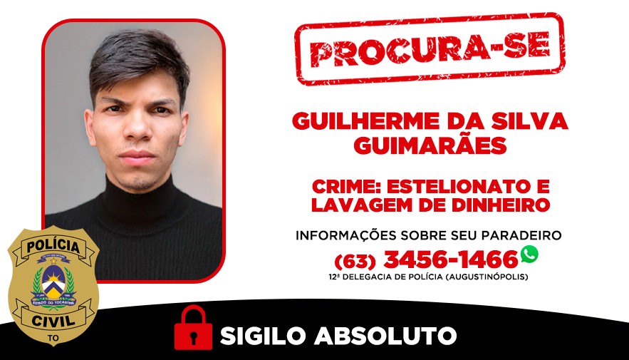 Um homem de 20 anos está sendo procurado pela 12ª Delegacia de Polícia de Augustinópolis, no Bico do Papagaio, por suspeita de aplicar golpes e dar prejuízos financeiros às vítimas. Guilherme da Silva Guimarães é investigado por induzir uma das vítimas a pagar um boleto falso no valor de R$ 15,6 mil, mas na verdade o valor foi parar em sua conta pessoal.
