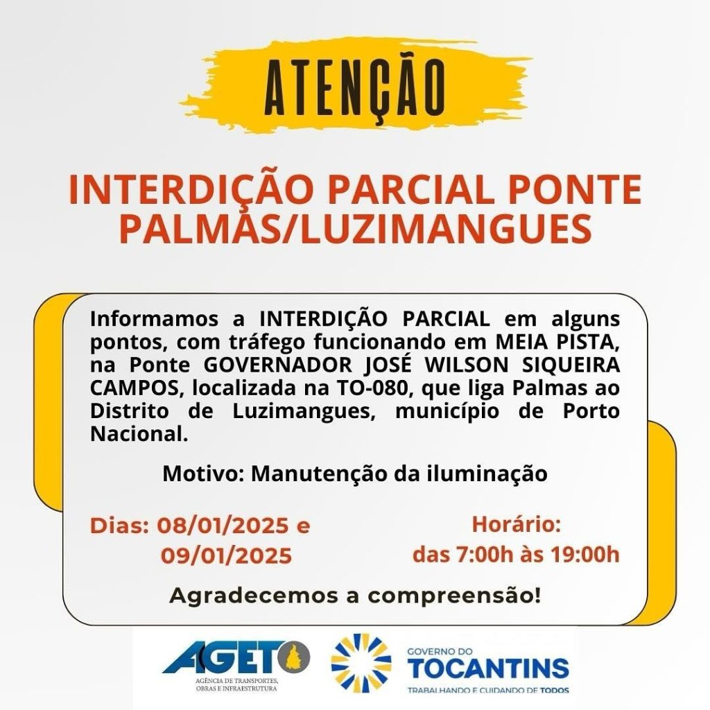 A ponte Governador José Wilson Siqueira Campos, entre Palmas e Luzimangues, terá períodos de interdição parcial nesta quarta-feira (8) e quinta-feira (9). Segundo a Agência de Transportes, Obras e Infraestrutura (Ageto) será realizada manutenção na rede de iluminação da via.