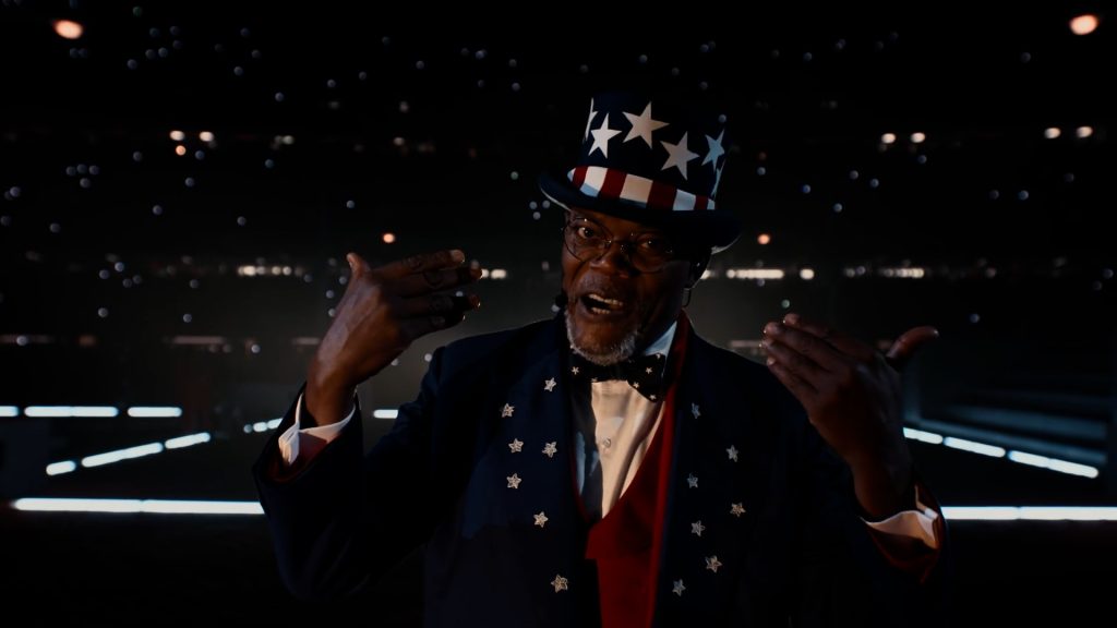 Samuel L. Jackson marcou presença como Tio Sam, personagem folclórico da cultura americana que é a personificação dos Estados Unidos. Ao longo do show, o ator guiava os atos da apresentação com frases como: “Bem-vindos ao maior jogo da América”.