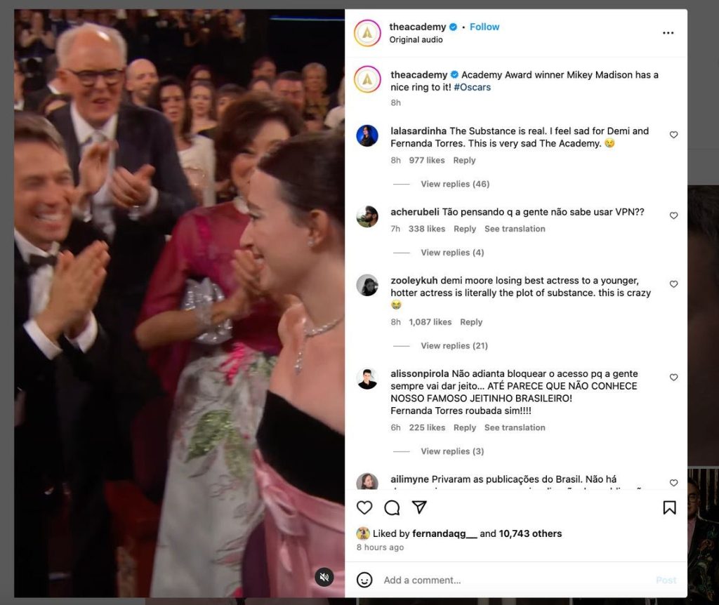 Nos comentários do vídeo de Mikey Madison, apesar do “bloqueio”, há comentários em português questionando a Academia pela medida.