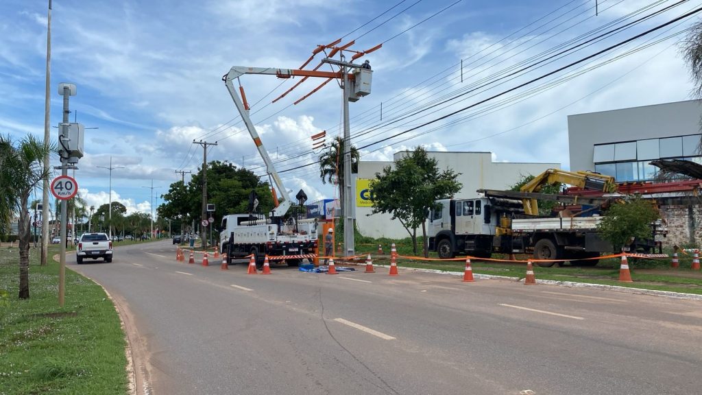 A Energisa informou que os locais afetados foram isolados e não houve impacto no fornecimento de energia. Poste de energia é sunbstituído após acidente, em Palmas