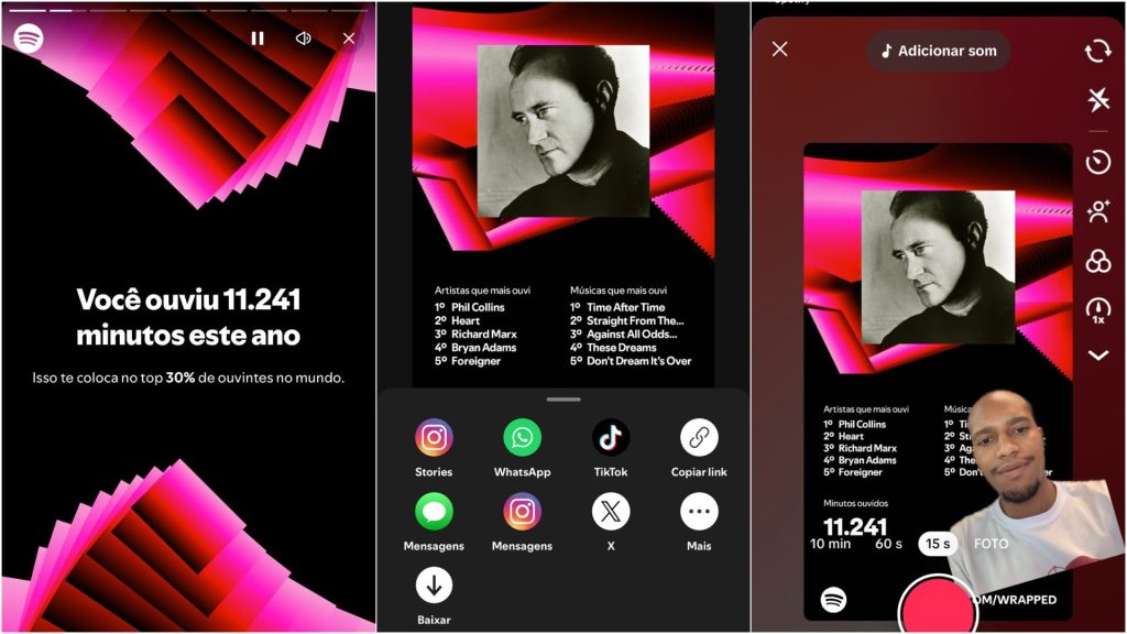 Após gerar a sua retrospectiva, o aplicativo permite compartilhar os registros no WhatsApp, Instagram (mensagens e stories), TikTok, Facebook, X, Mensagens (SMS) ou baixar no celular.