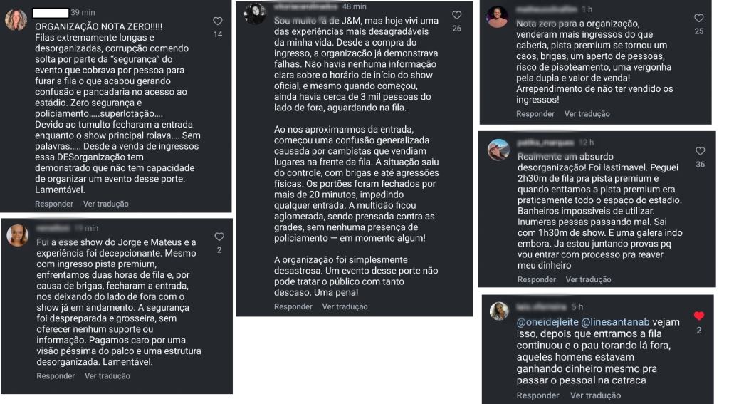 “Ouvi relatos na fila do banheiro de pessoas que subornaram os seguranças para conseguir entrar. Já fui em diversos shows do Jorge e Mateus como fã mesmo, nunca vi nada desse tipo”, comentou.
