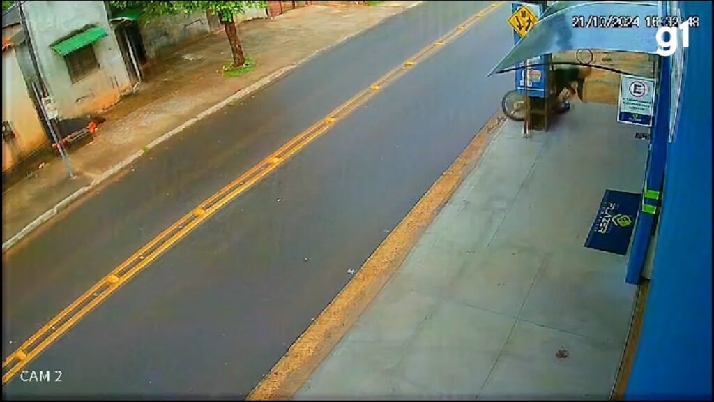 Câmeras de segurança de uma distribuidora registraram o momento do acidente. No vídeo é possível ver o motociclista perdendo o controle, invadindo a contramão, acertando o poste e caindo em frente ao comércio.